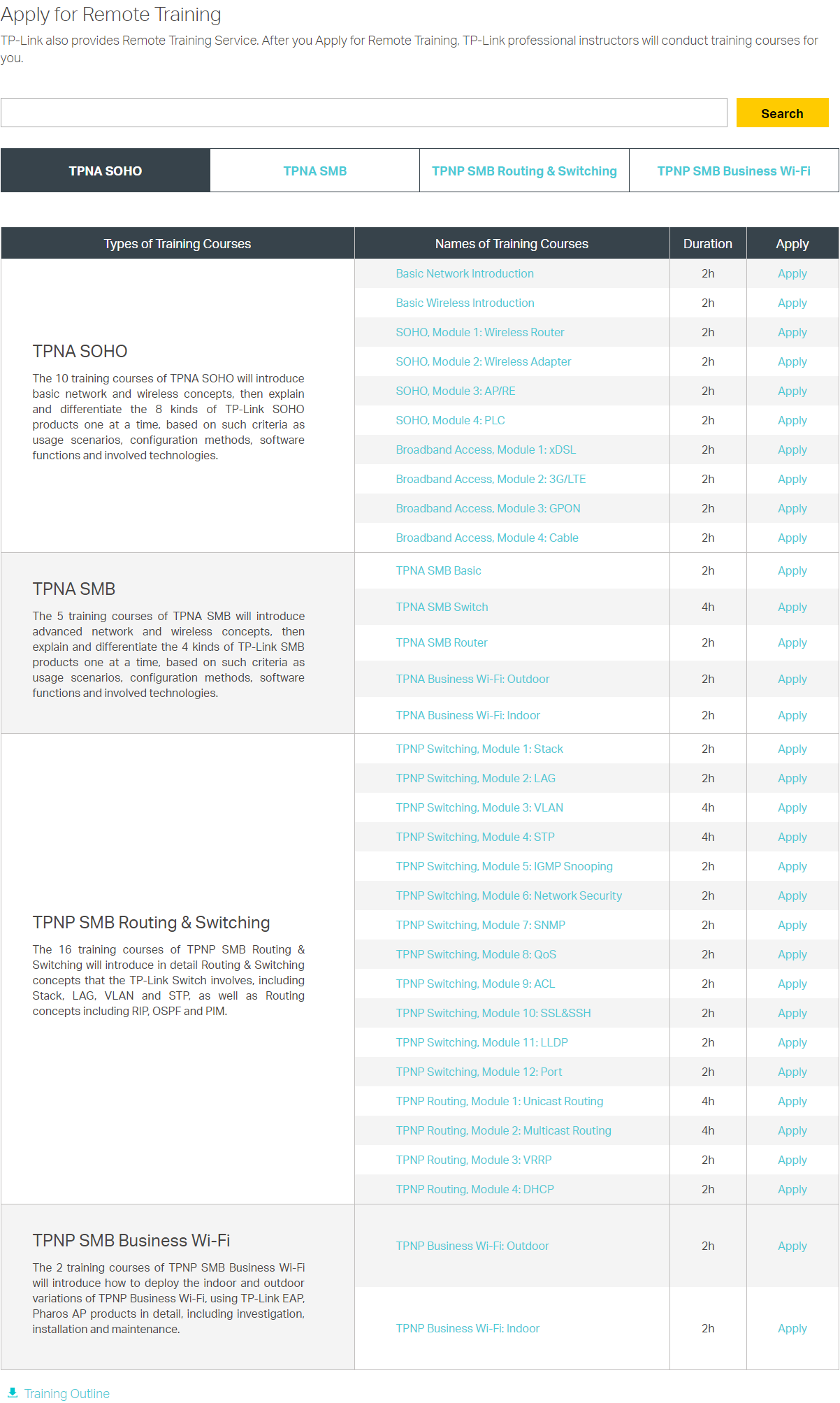 Once completing all the relevant modules of a TP-Link Training course, you may apply for a corresponding TP-Link Certificate exam. If you are interested in TP-Link Training & Certification Program and want to apply for TP-Link training courses, you must first become a TP-Link Partner. Please click the "Apply" button below to become an authorized TP-Link Partner.